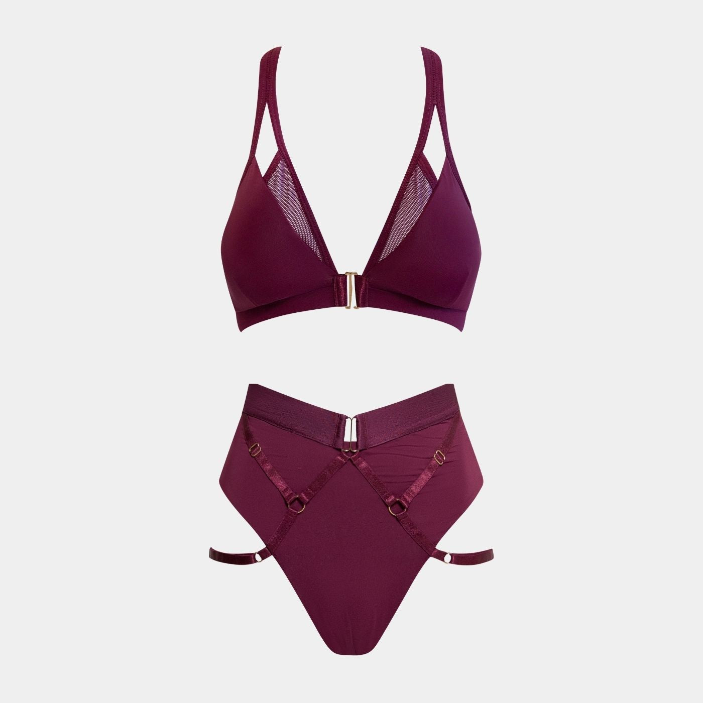 A bold yet romantic pole dance outfit in a rich wine hue. The Sofia Bra’s intricate detailing pairs effortlessly with the sultry garter design of the Perla Shorts, creating a fierce, feminine look that flatters every curve.