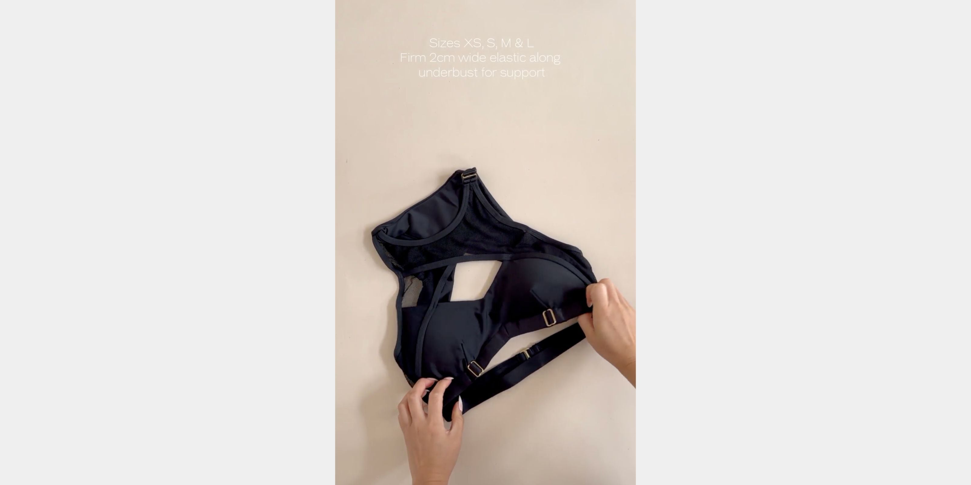 - Firm 2cm wide elastic along underbust for support for sizes XS-M
