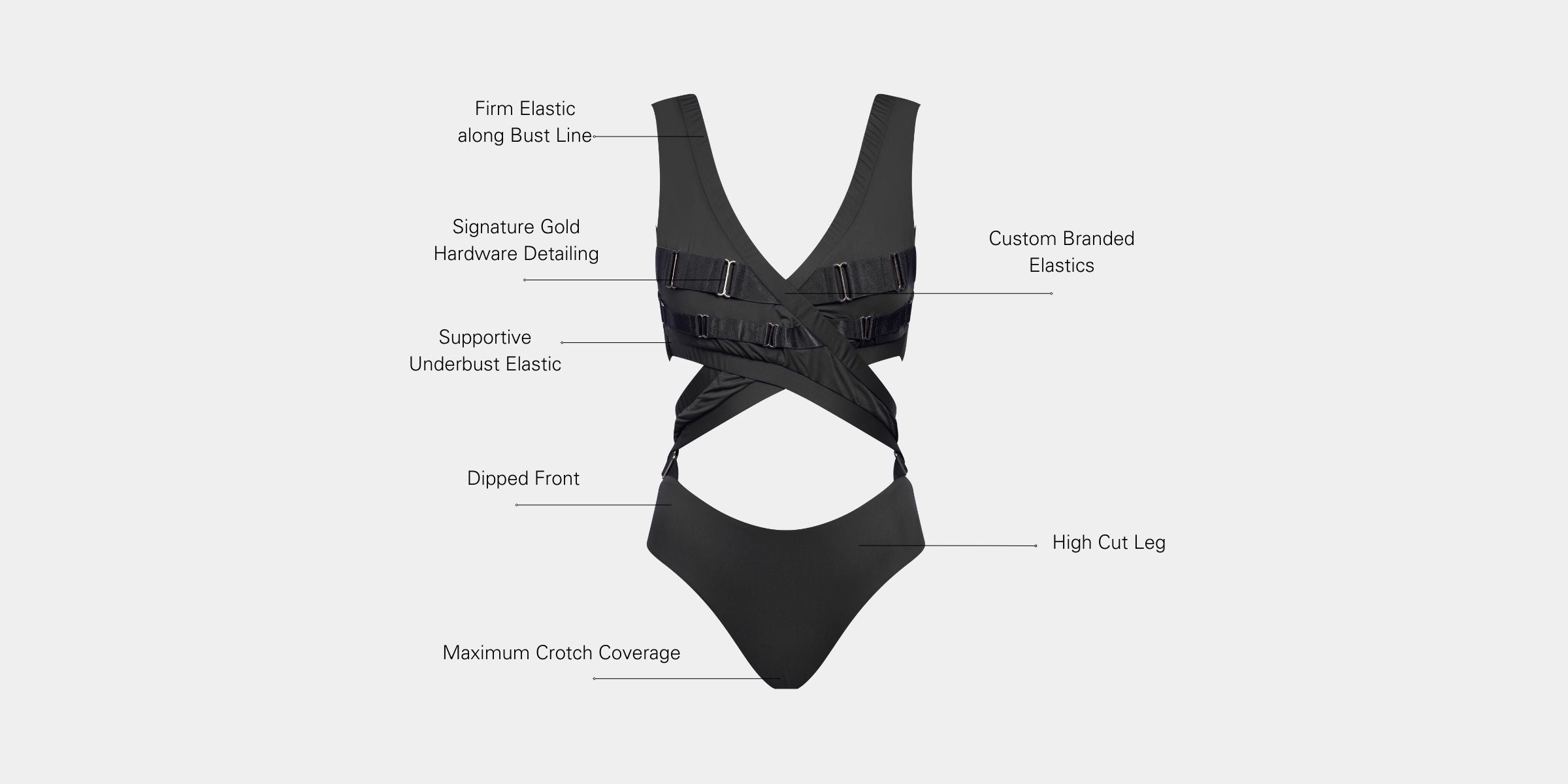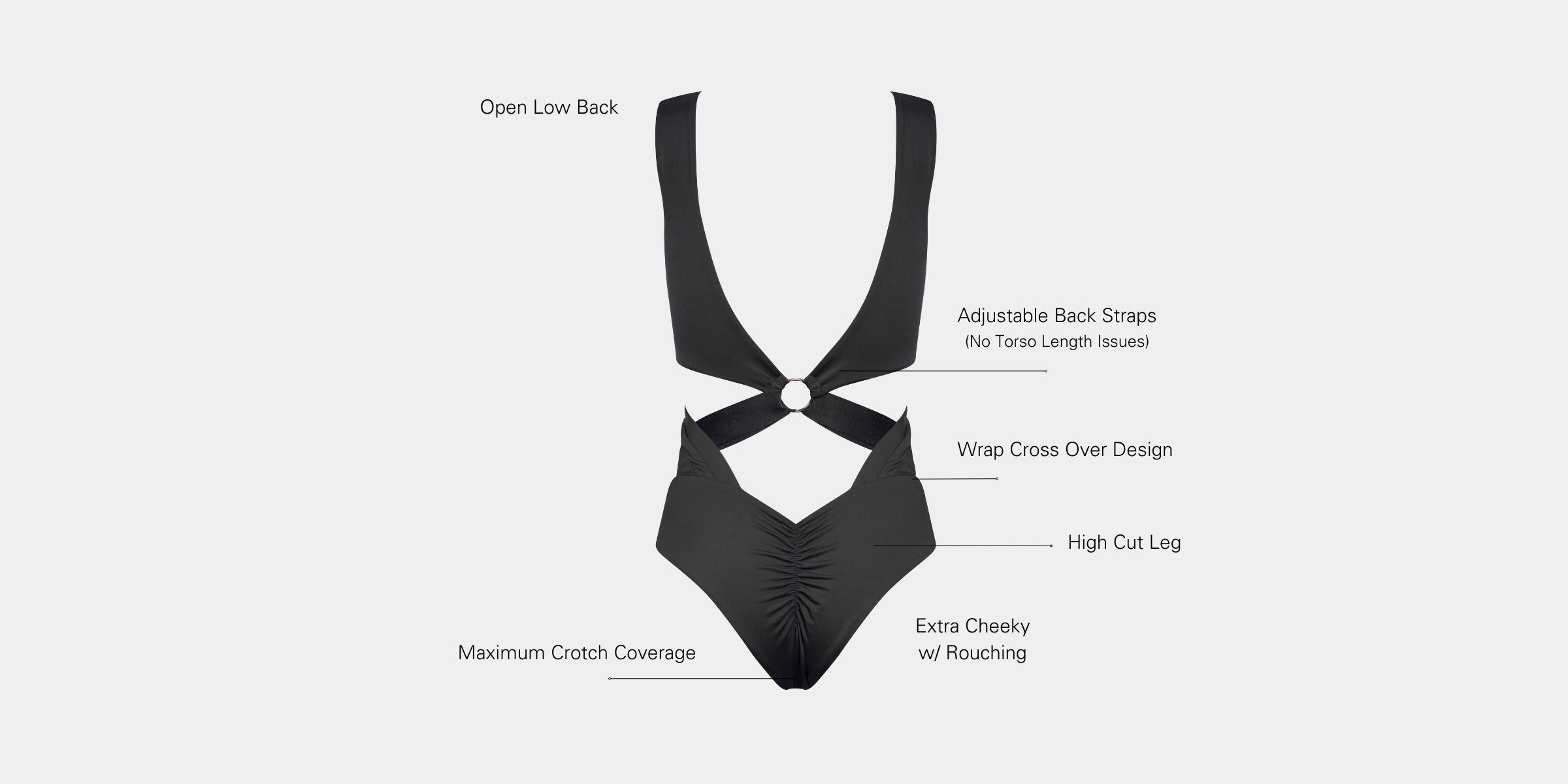 High cut leg with a dipped front - Extra cheeky cut bottoms with rouching